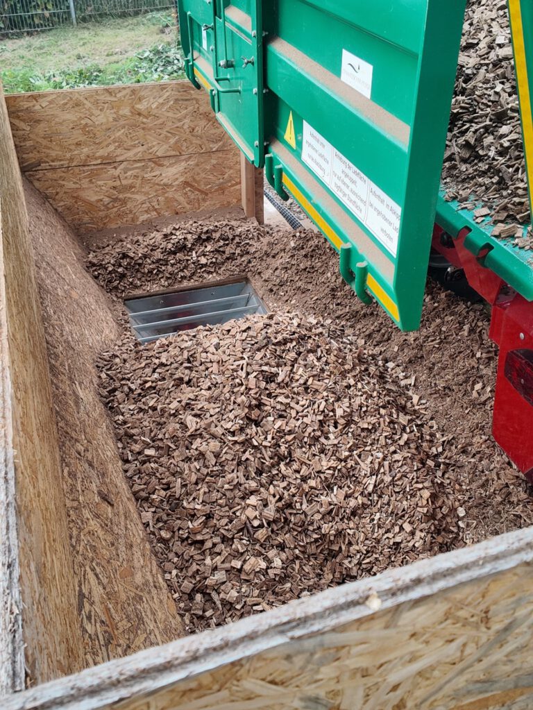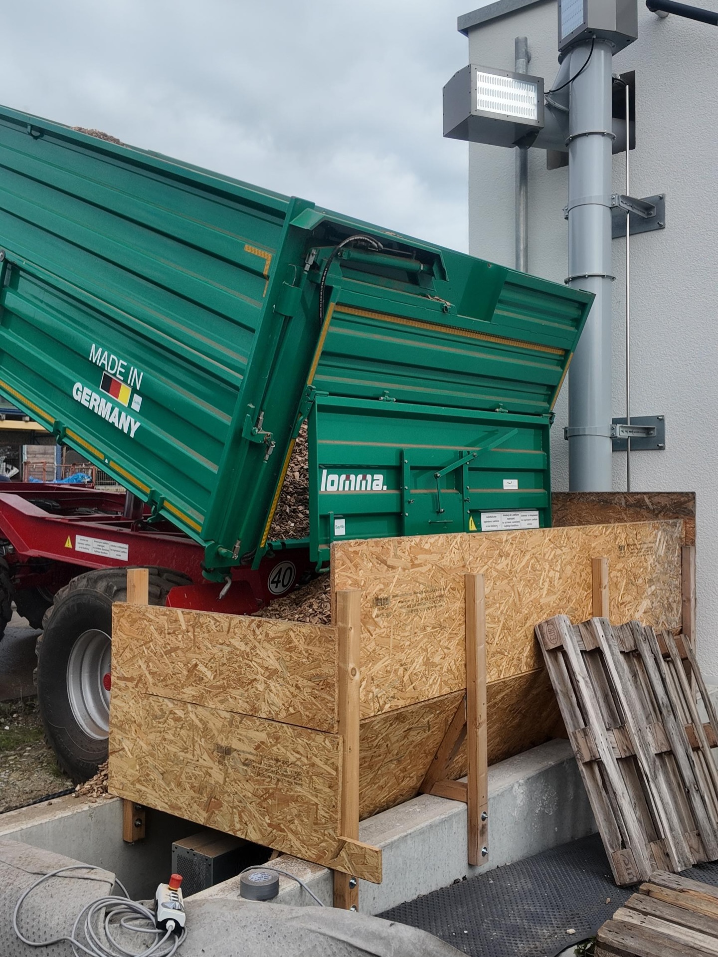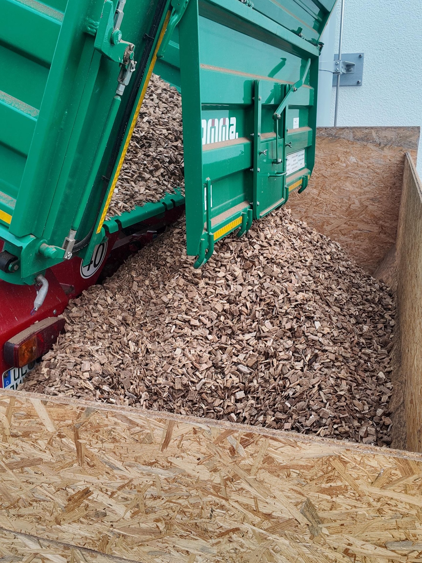 Heute stand wieder die Befüllung an – frische Hackschnitzel aus einem regionalen Holzlager.
