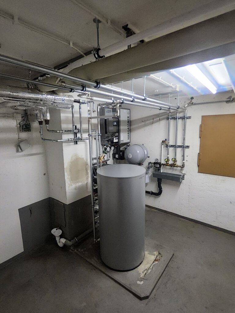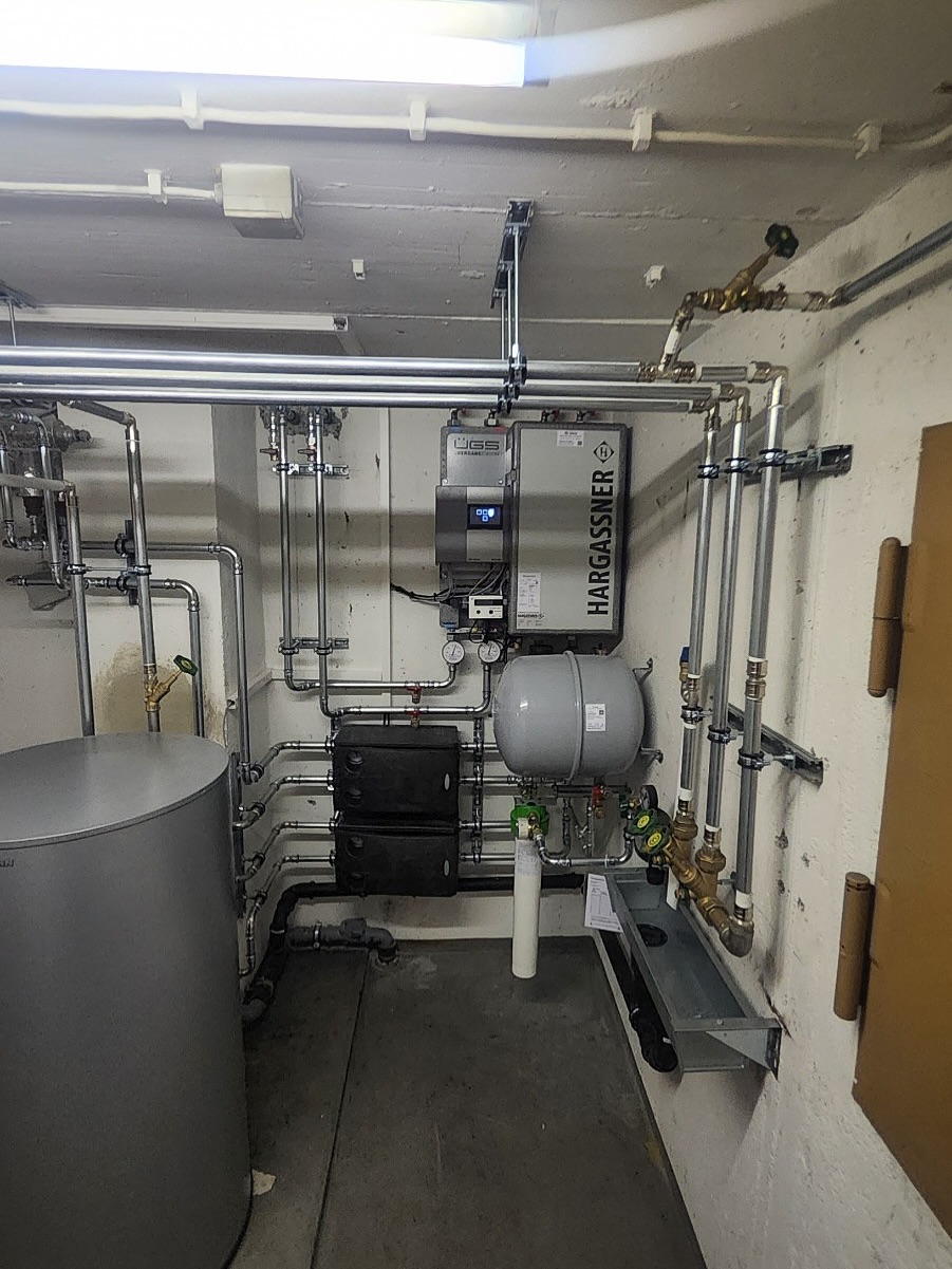 Wir haben eine alte Ölheizung stillgelegt und das Haus über eine Übergabestation im Gebäude an eine zentrale Hargassner-Heizanlage angeschlossen.